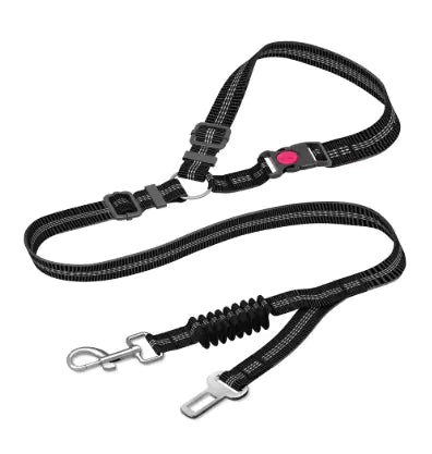 Durable nylon tactical dog leash featuring a secure frog buckle, ergonomic hand grip, and built-in functionality as a dog car seat belt. Designed to provide safety and comfort while walking large dogs and keeping them secure during car rides. Available in multiple colors.